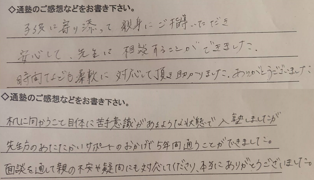 学習面はもちろん、メンタル面でのサポートをしていただき、本人も最後まであきらめずとり組めたと思います。